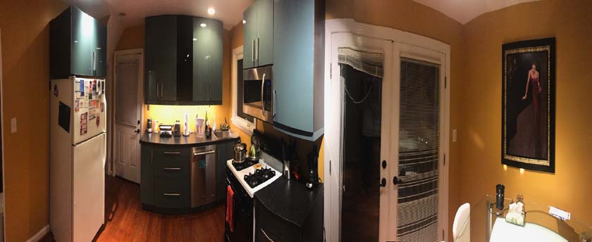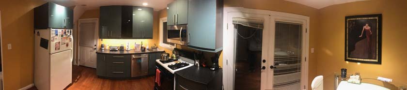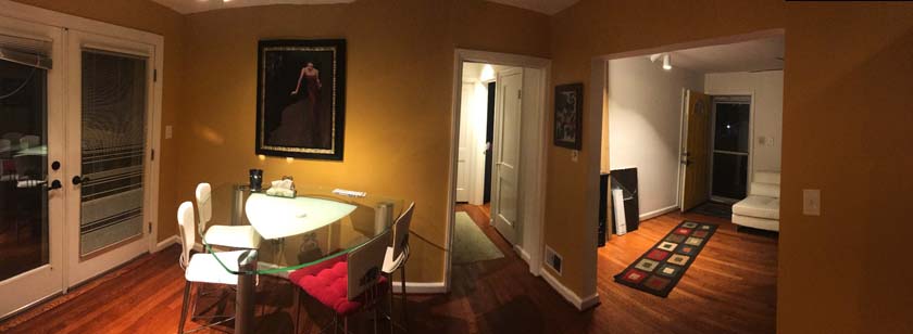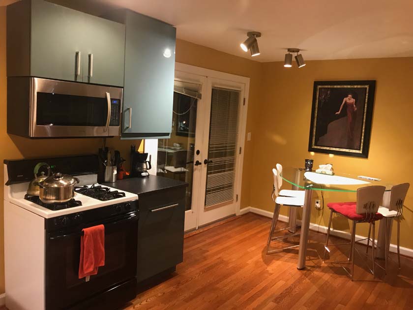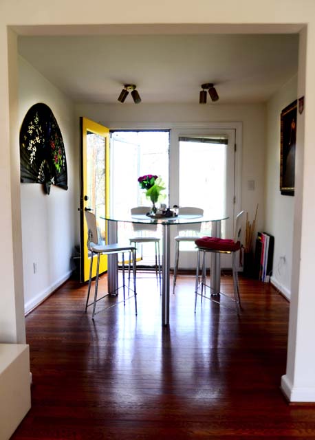 Dining Room is located on the Main Floor and is connected with Kitchen, Living Room, both bedrooms, main floor bathroom, large deck in backyard. This room has a double panel glass door which allows you to enjoy the view of backyard, Arlington county state park and Pentagon City high rises(winter time) during your dining experience. The room is equipped with modern triangular glass table with four white stool style modern chairs.