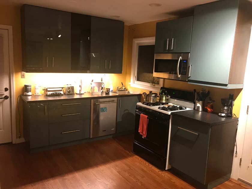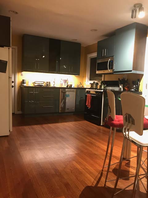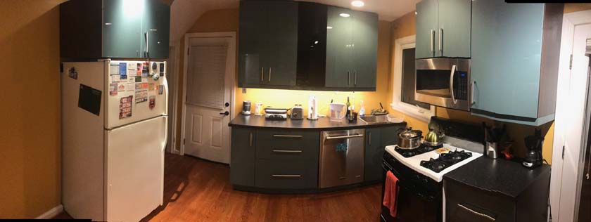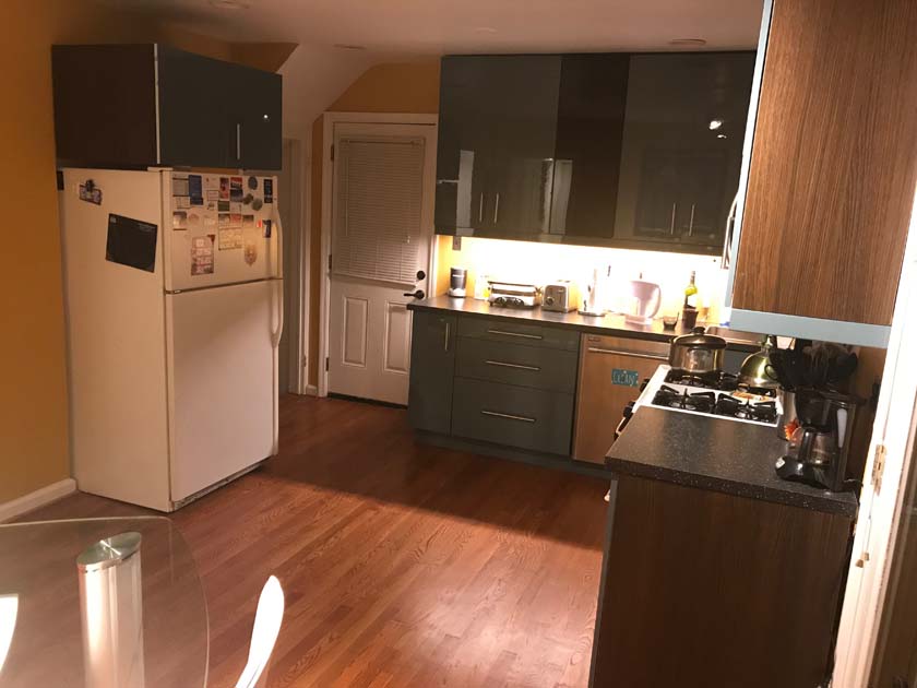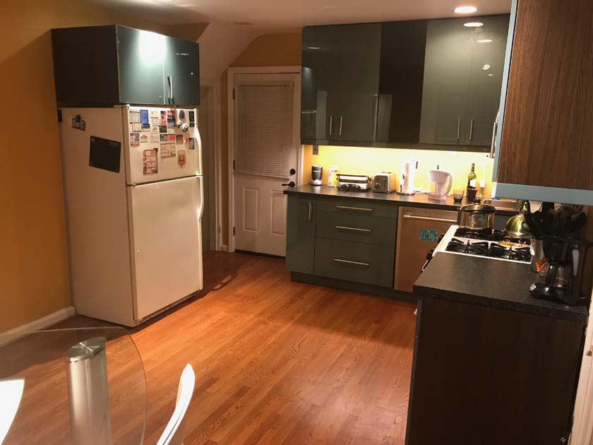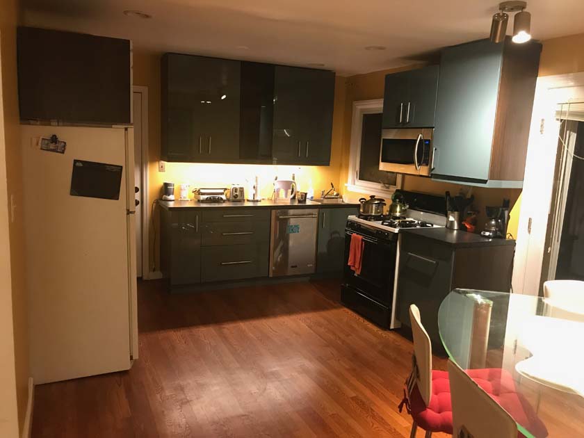 The Kitchen is located at the Main floor of the house next to the dining room and is connected to the basement stairs of the house. It has two entrances; one from dining room and the other from the left side of the house. It has a window overlooking the backyard and private deck.The following are few pictures of Kitchen: