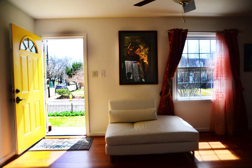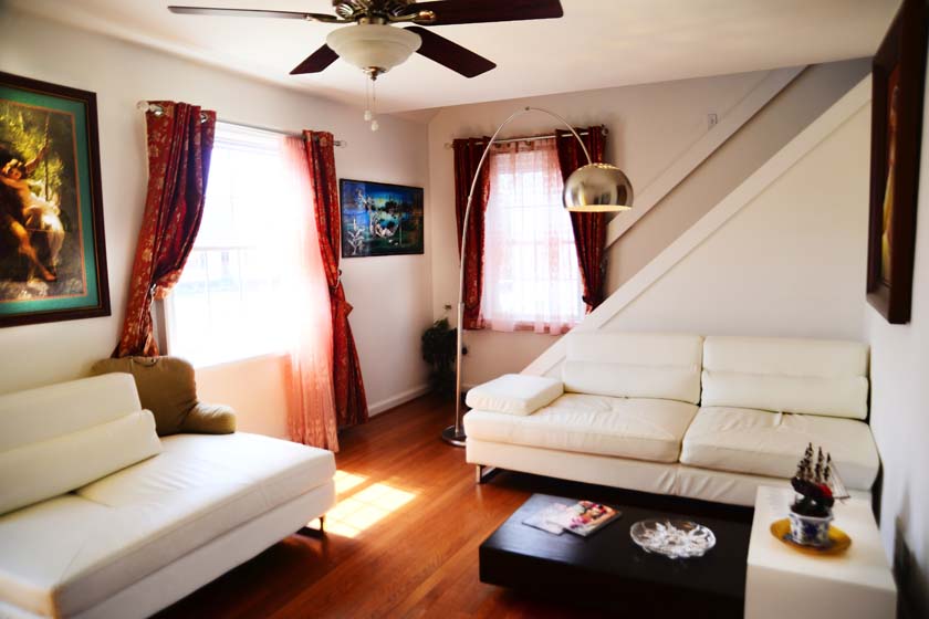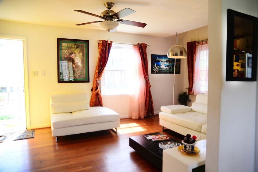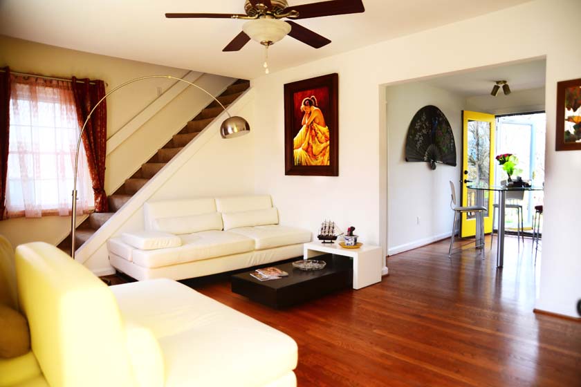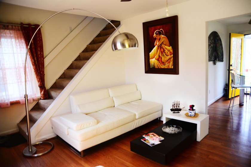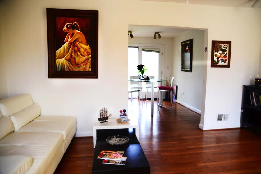 The living room is located at the Main Floor and is the first room if you enter from the front entrance of the house. The living room has wooden floors with Cherry finish and has modern furniture with a signature silver floor arch lamp and a modern coffee table.